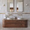 Mirrors are immensely important in affecting the perceived size of a space. Check out our blog post called Mirror Guide; Selecting the Right Size, Shape & Quality for some specifics on selecting the right mirror for your bathroom. Ultimately, when there are two mirrors above two sinks, those mirrors each need to be longer than the sink. When there is one mirror above one or more sinks, it should nearly span the length of their countertop. This will optimize the amount of light and space reflected, making the bathroom feel larger.